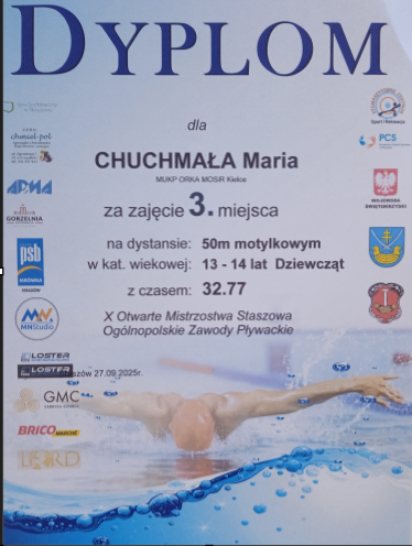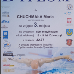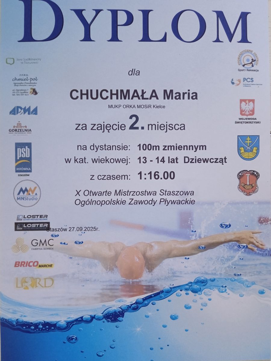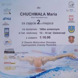 Marysia Chuchmała uczestniczyła w X otwartych mistrzostwach Staszowa - Ogólnopolskich Zawodów Pływackich. Zajęła 2 miejsce na dystansie 100m st. zmiennym i 3 miejsce na dystansie 50m st. motylkowym.